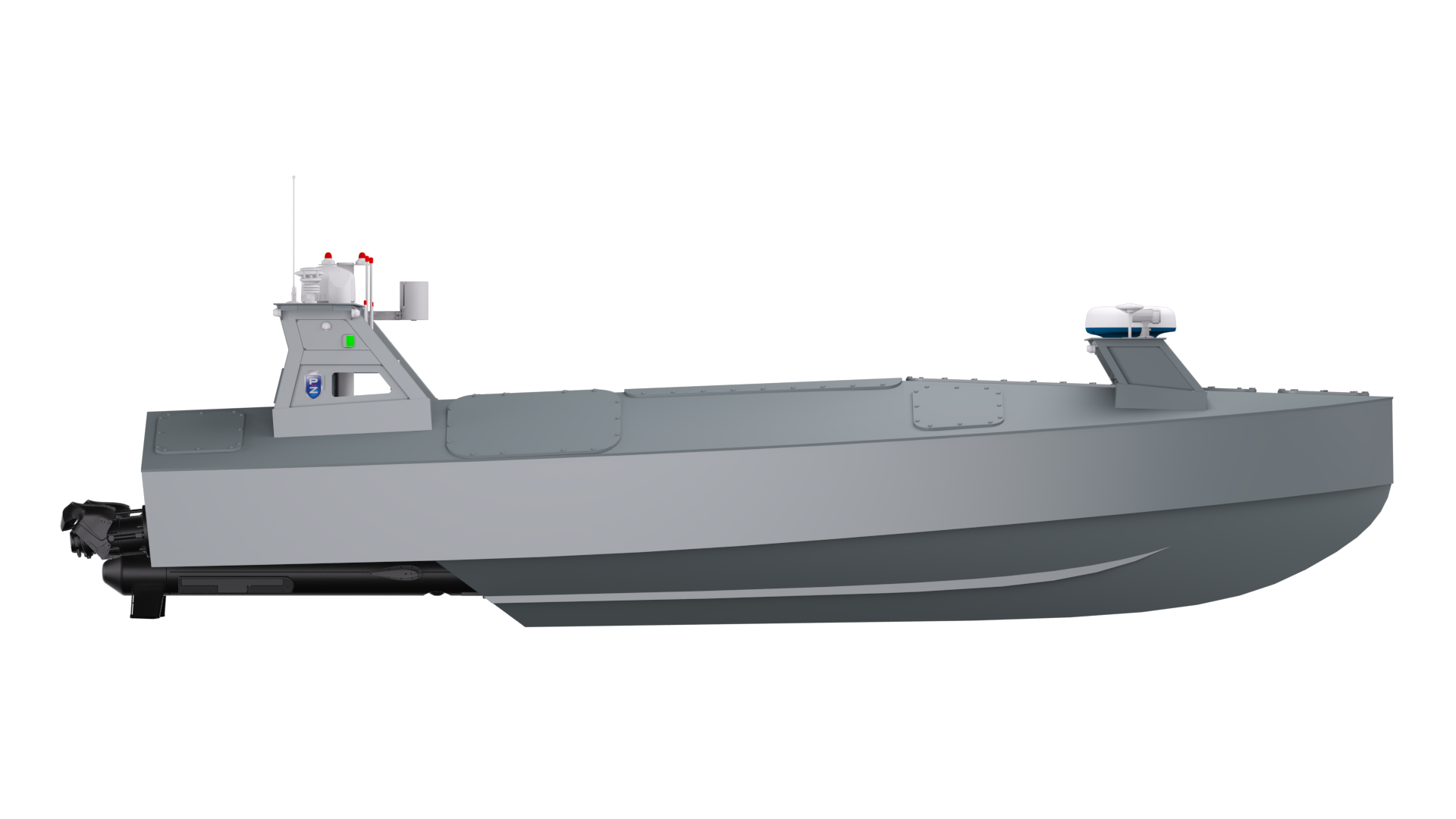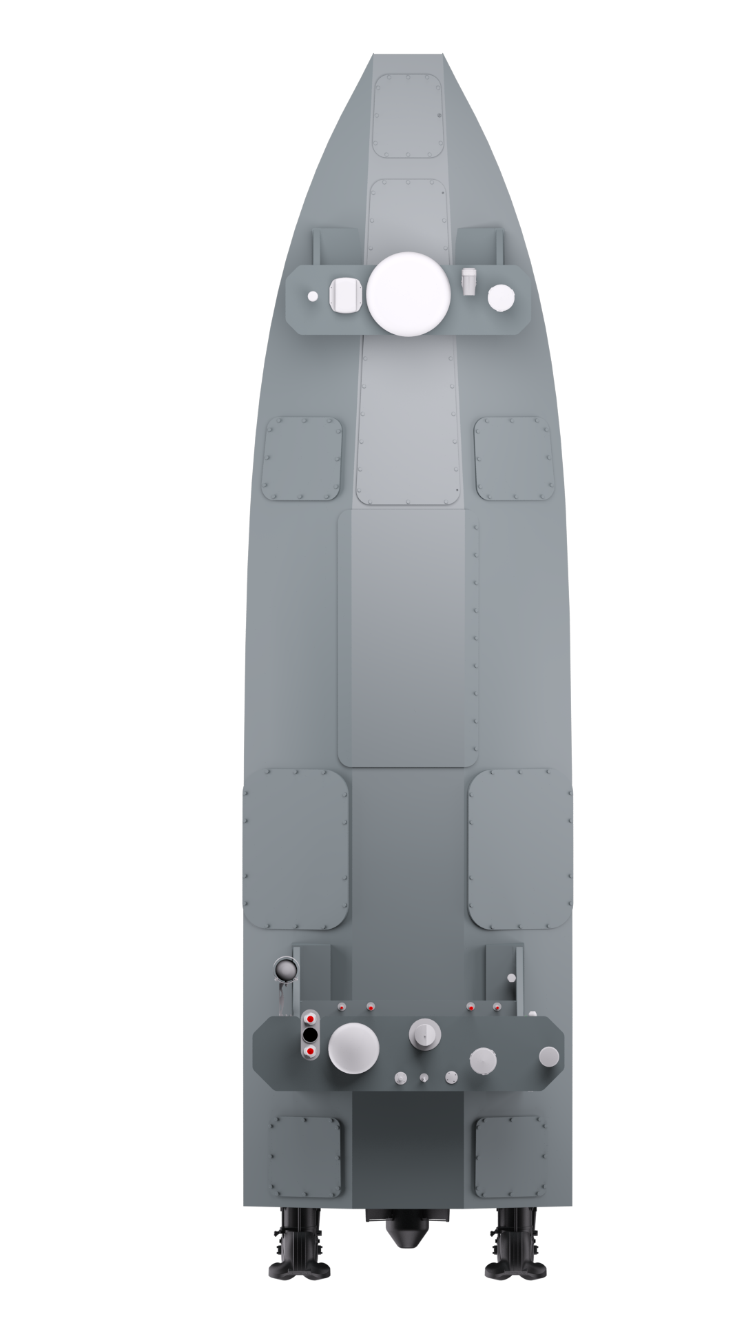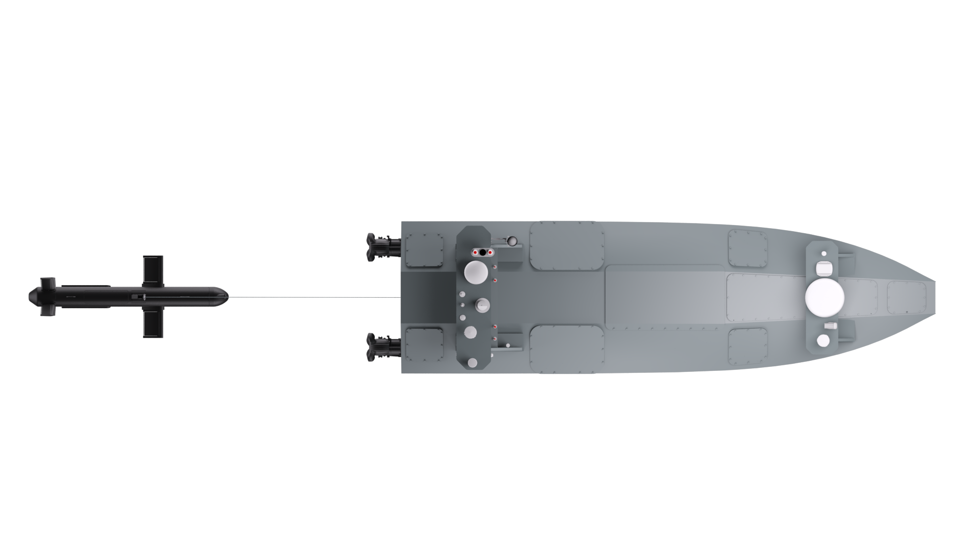 The purpose of this vessel is to act as a mothership and charging station for anti-mine drones. The client requested that it be small and difficult to see.