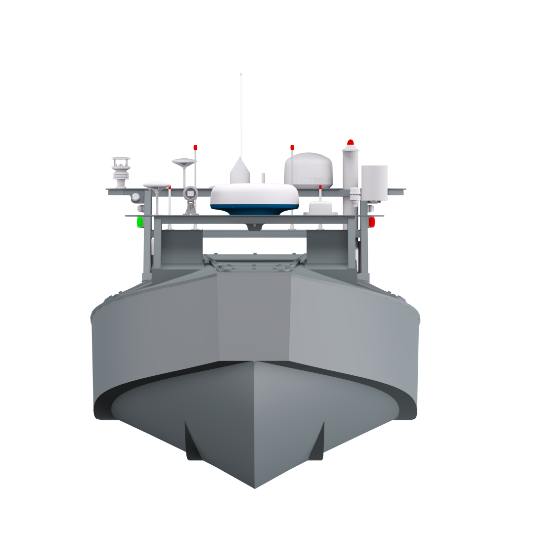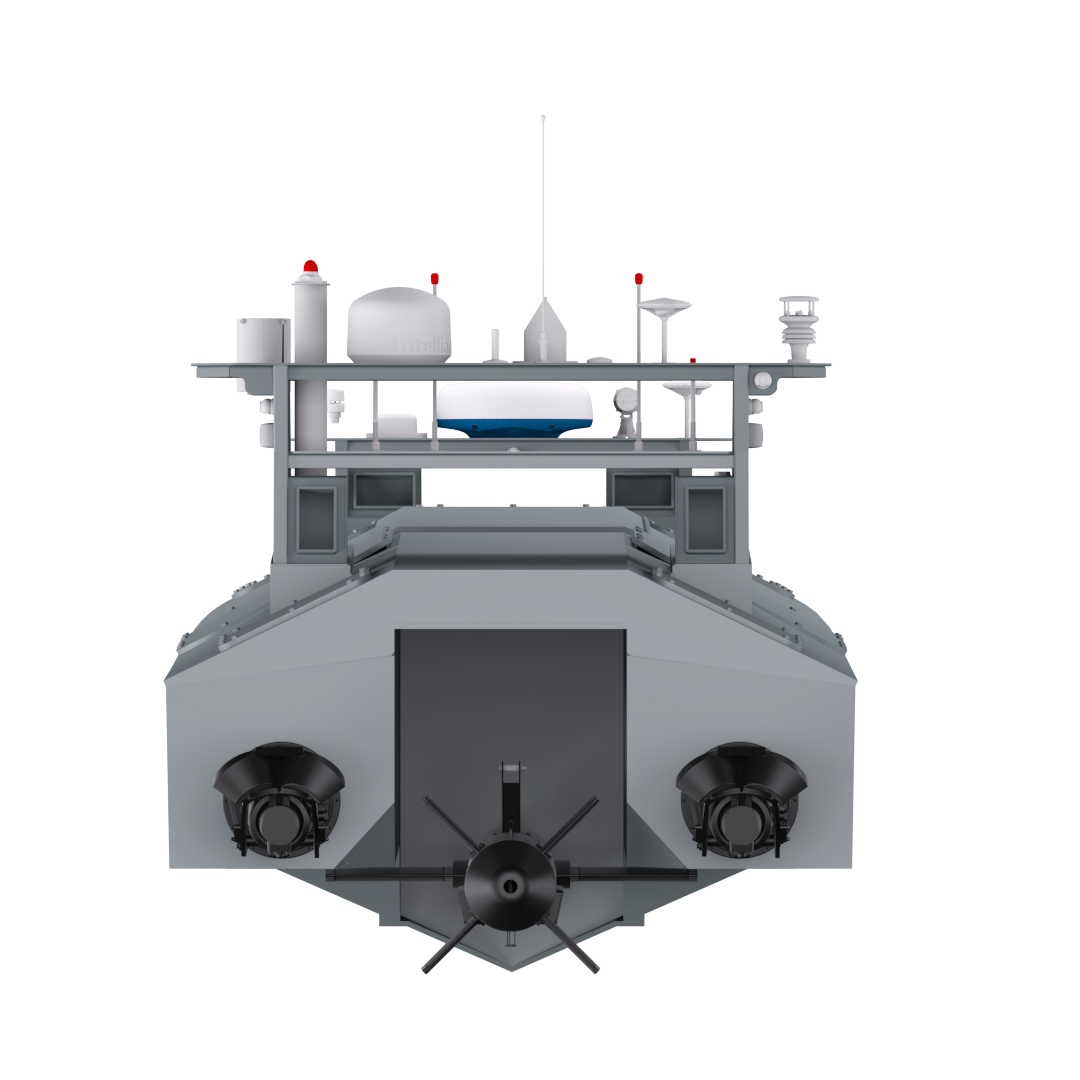 The vessel runs on twin waterjet motors, giving it high thrust and speed, however sacrificing manoeuvrability. The antennae are curated to include all autonomous navigation capabilities, along with radar, and sonar.